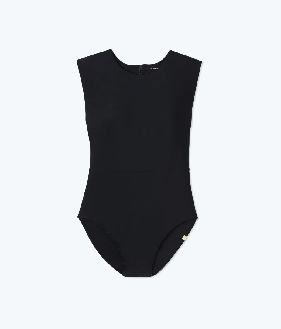 High-neck meets high fashion in this full-coverage, colorblocked beauty.
